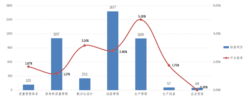 2021年下半年,对全市预拌混凝土企业进行专项检查115家次,检查内容涵盖企业质量管理体系、原材料质量管理、配合比设计、试验管理、生产管理、生产设备、企业资质等方面,涉及各类具体检查指标共计7大项89小项。2021年下半年共计检查4363项,其中发现问题126项,检查合格率97.11%,较上半年提高1.58个百分点。从检查总体情况来看,各企业质量管理情况良好,技术负责人及相关技术人员配备情况符合资质标准要求;原材料进场验收规范、质量控制良好;配合比设计合理且能够较好的执行,有比较完整的配合比调整授权和依据;混凝土试验、生产管理各项制度基本落实到位;混凝土试验设备配备齐全,试验标准有效,试验项目齐全;混凝土搅拌设备计量检定准确,视频可实时储存、导出、查询;混凝土强度保证率较高。各项检查内容的不合格情况见图1。